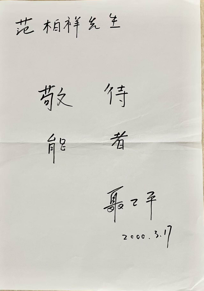 但我得意没多久,老聂在离开广州前给我留话,让我看清他的所谓“降书”。我仔细一看,差点晕倒。原来,老聂在写完正文和落款后,特意在2A纸顶上写了个上款,没有标点的完整读下来,便是“范柏祥先生敬待能者聂卫平”(下图),胜负瞬间易主!